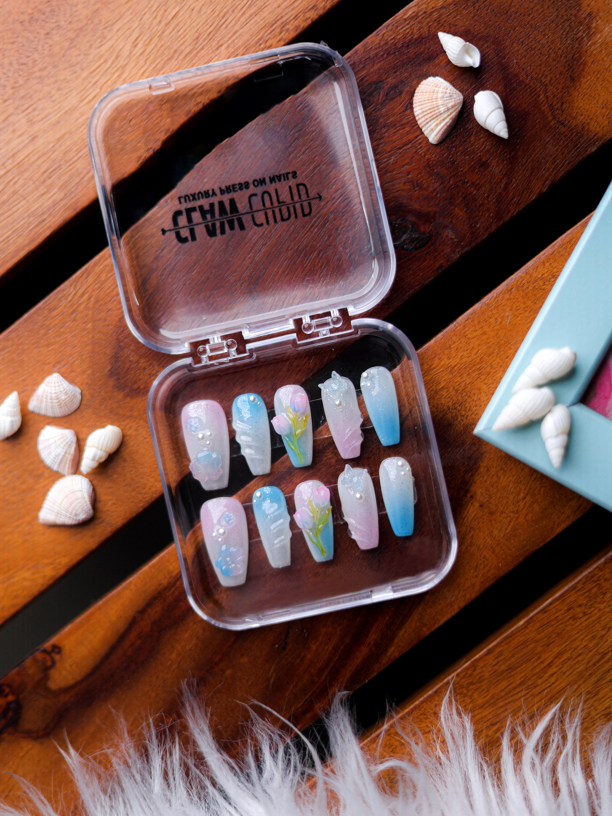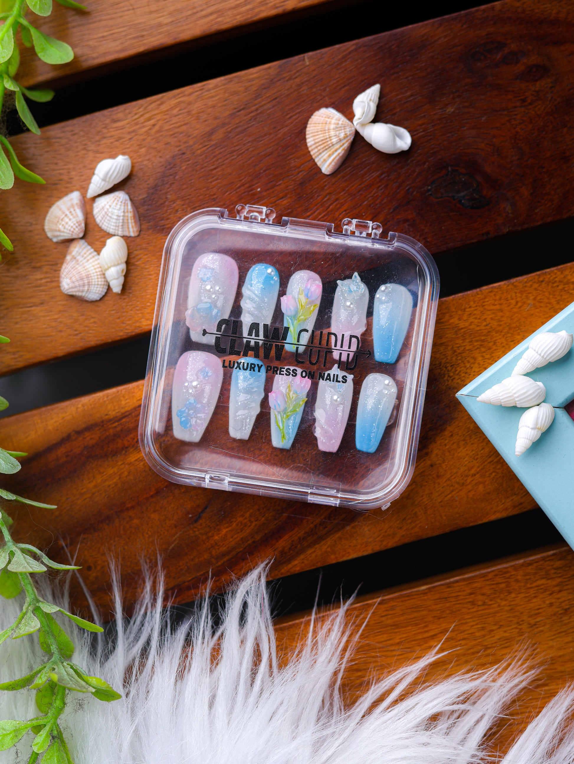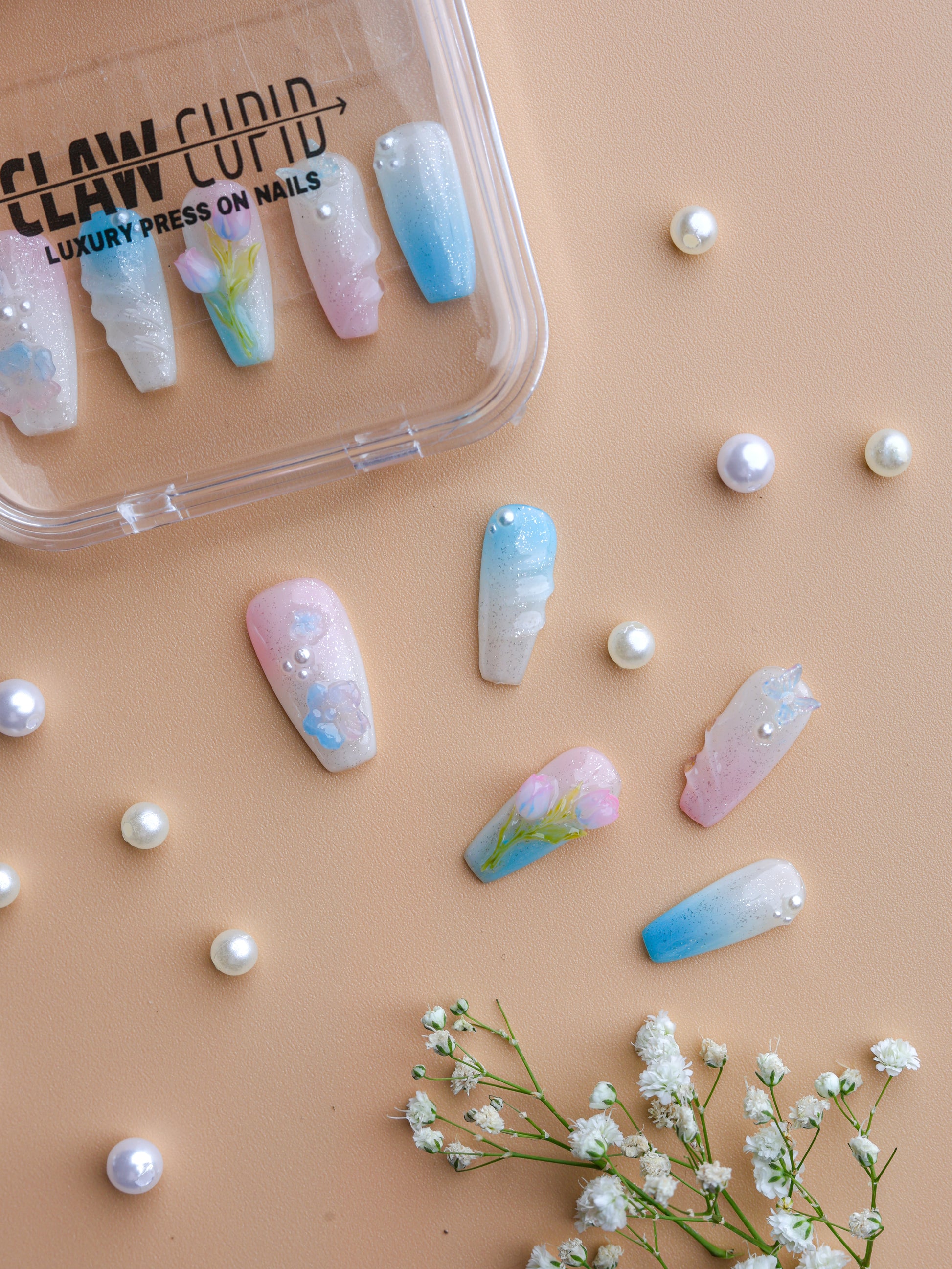 Step into a dreamy blend of heavenly elegance and floral charm with our Celestial Garden Press-On Nails. Featuring a breathtaking ombre of soft blues and blush pinks, these nails are adorned with delicate 3D flowers, pearl accents, and subtle shimmer, creating an ethereal, nature-inspired look. Perfect for special occasions, vacations, or adding a touch of magic to your everyday style.