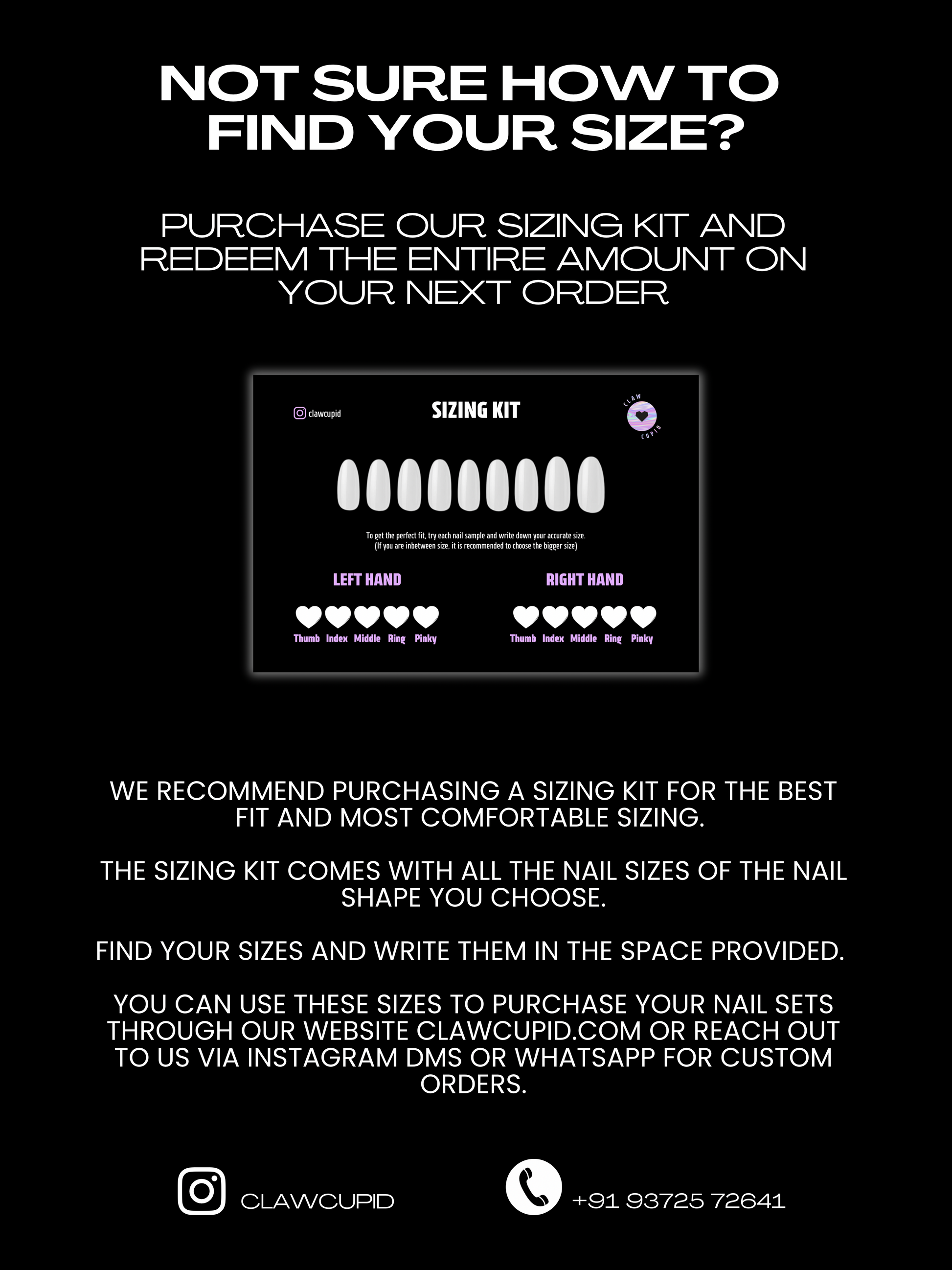 Find your perfect fit with our Press-On Nail Sizing Kit, designed to help you choose the ideal size for your custom press-on nails. Available in multiple shapes, this kit ensures you get a flawless, comfortable fit every time. Best of all, the cost of the sizing kit counts toward your first order! You'll receive a discount code to redeem once you place your order, making your first purchase even more exciting!