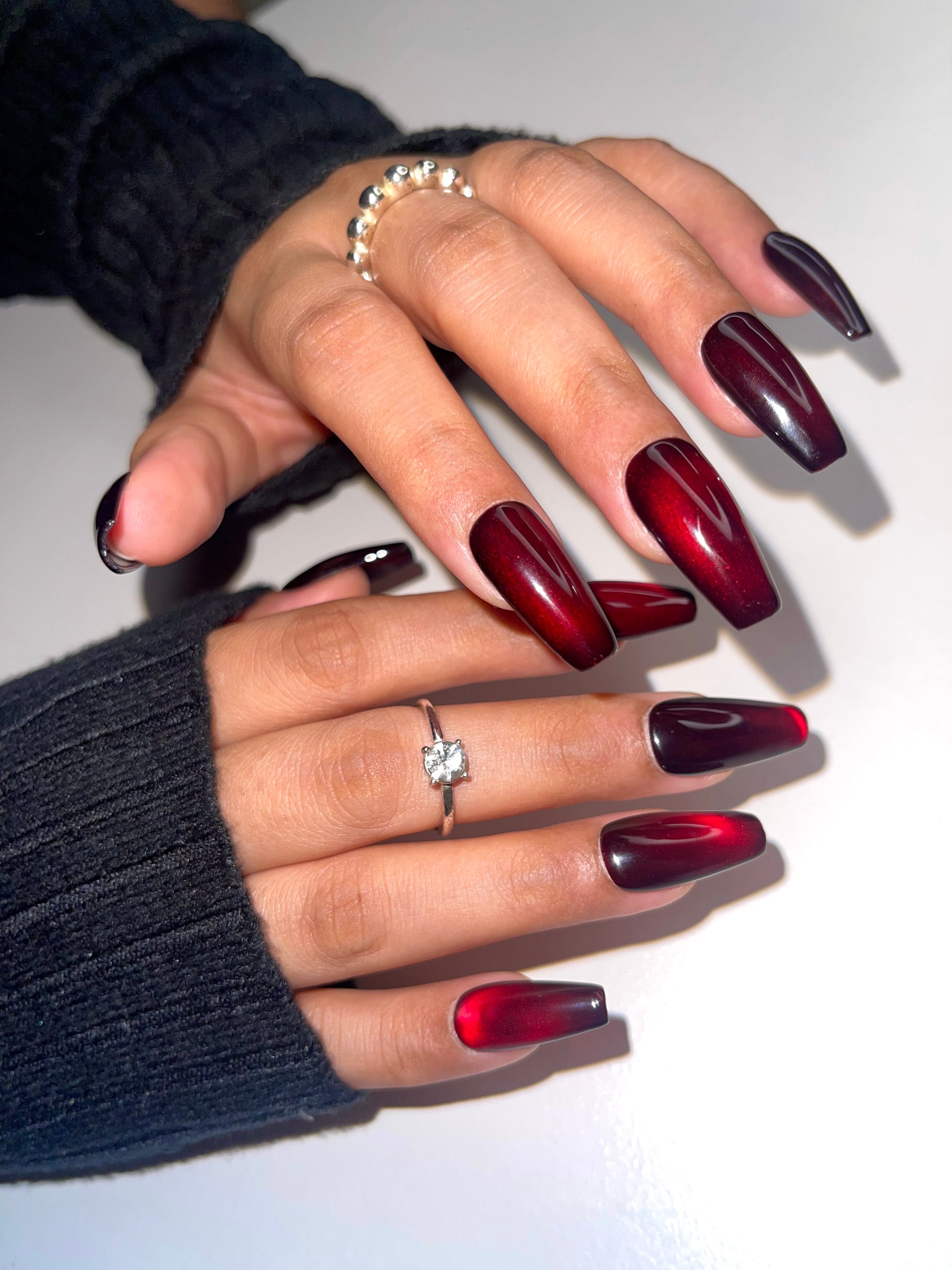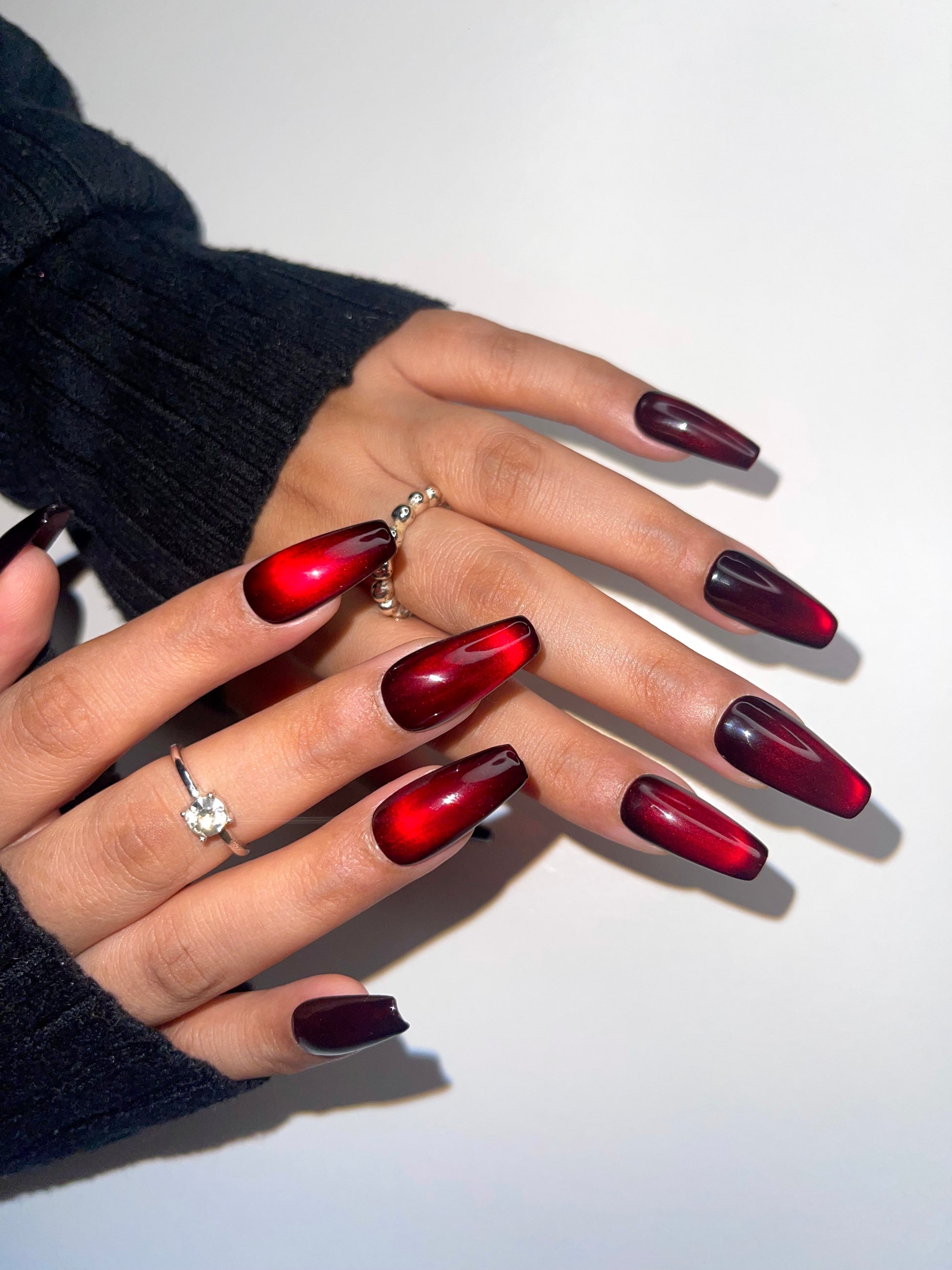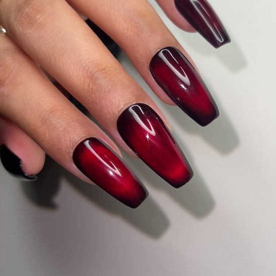 A rich deep red hue with hypnotic cat-eye depth—dramatic, sultry, and statement-making.