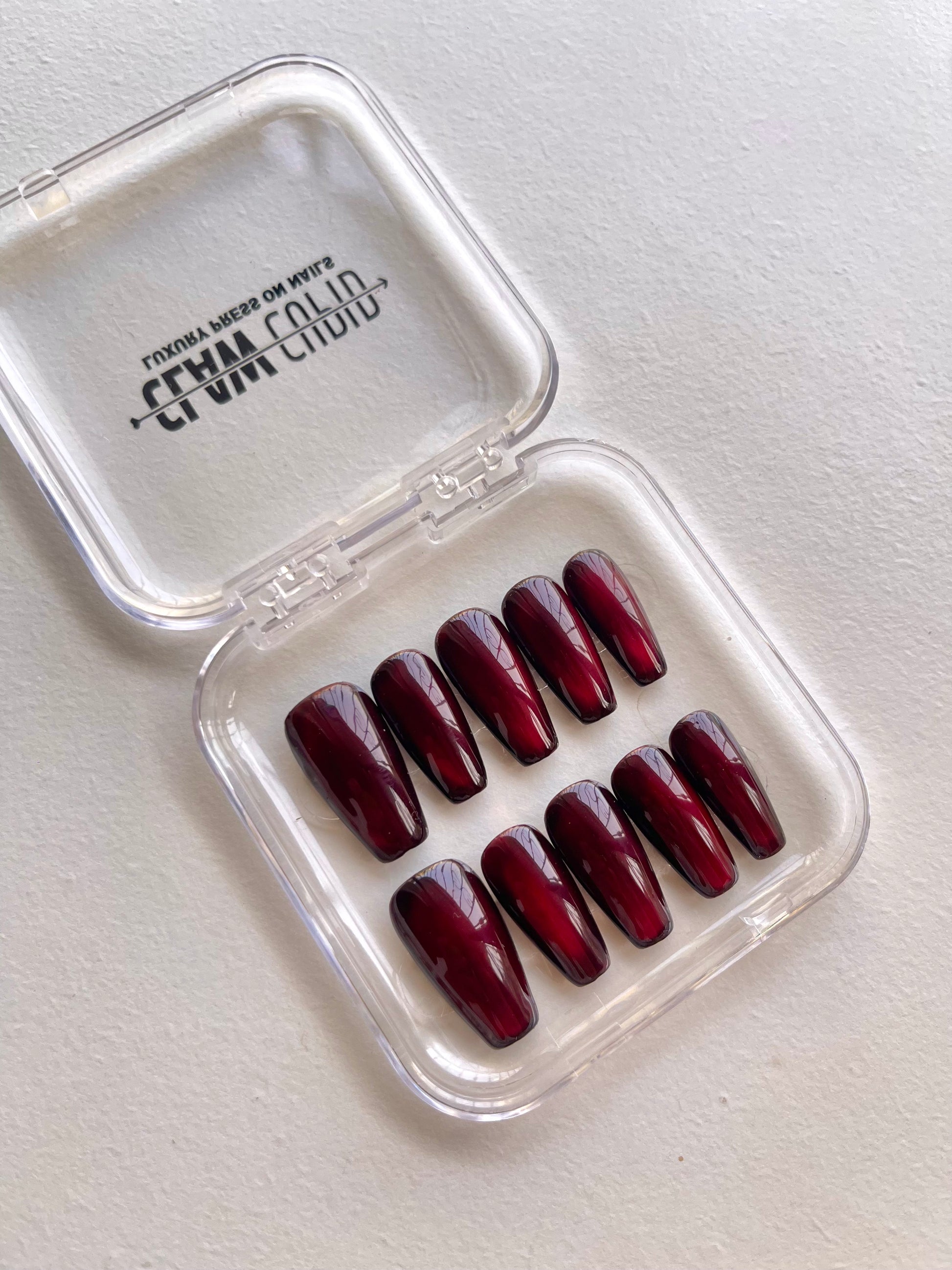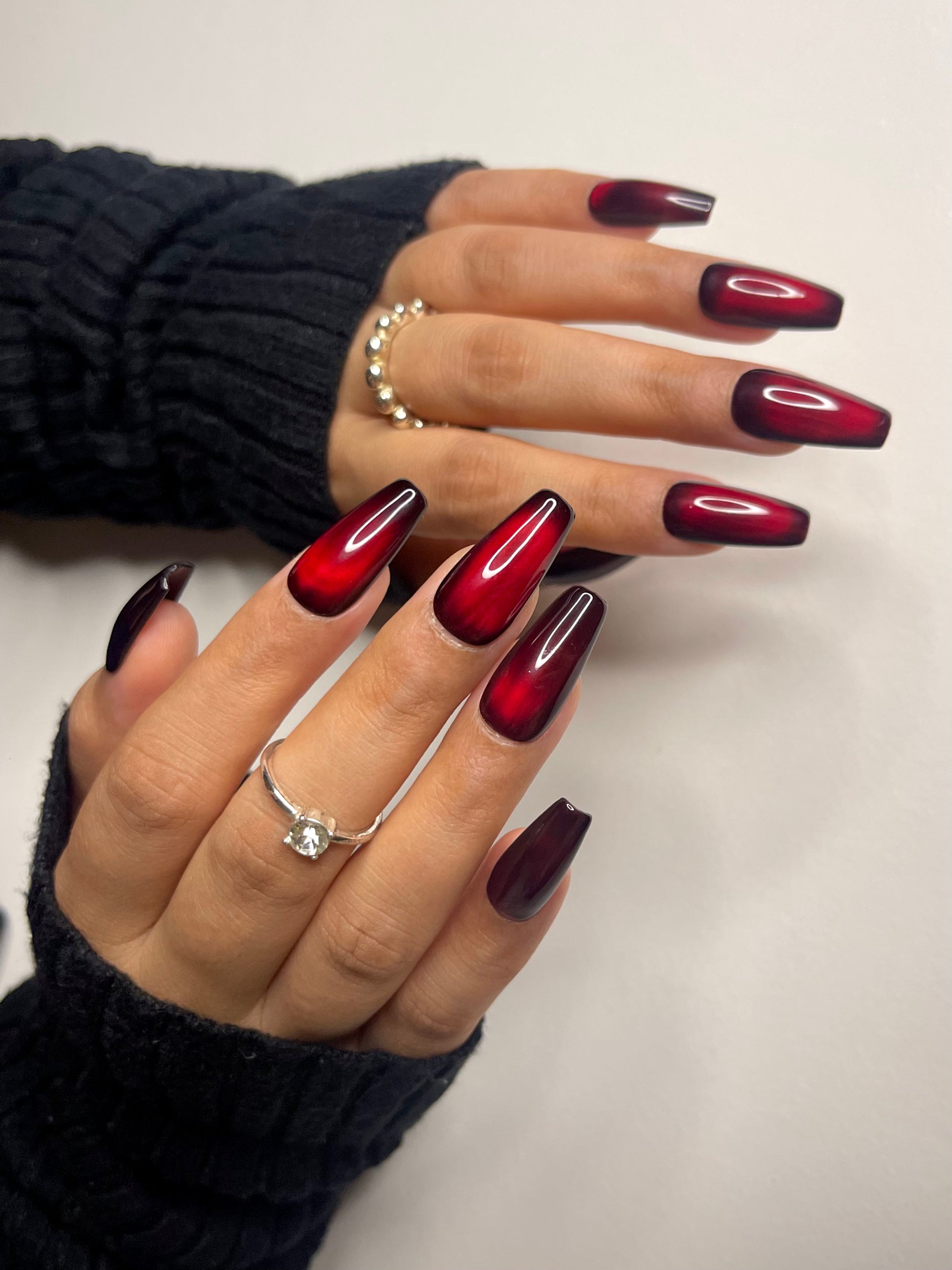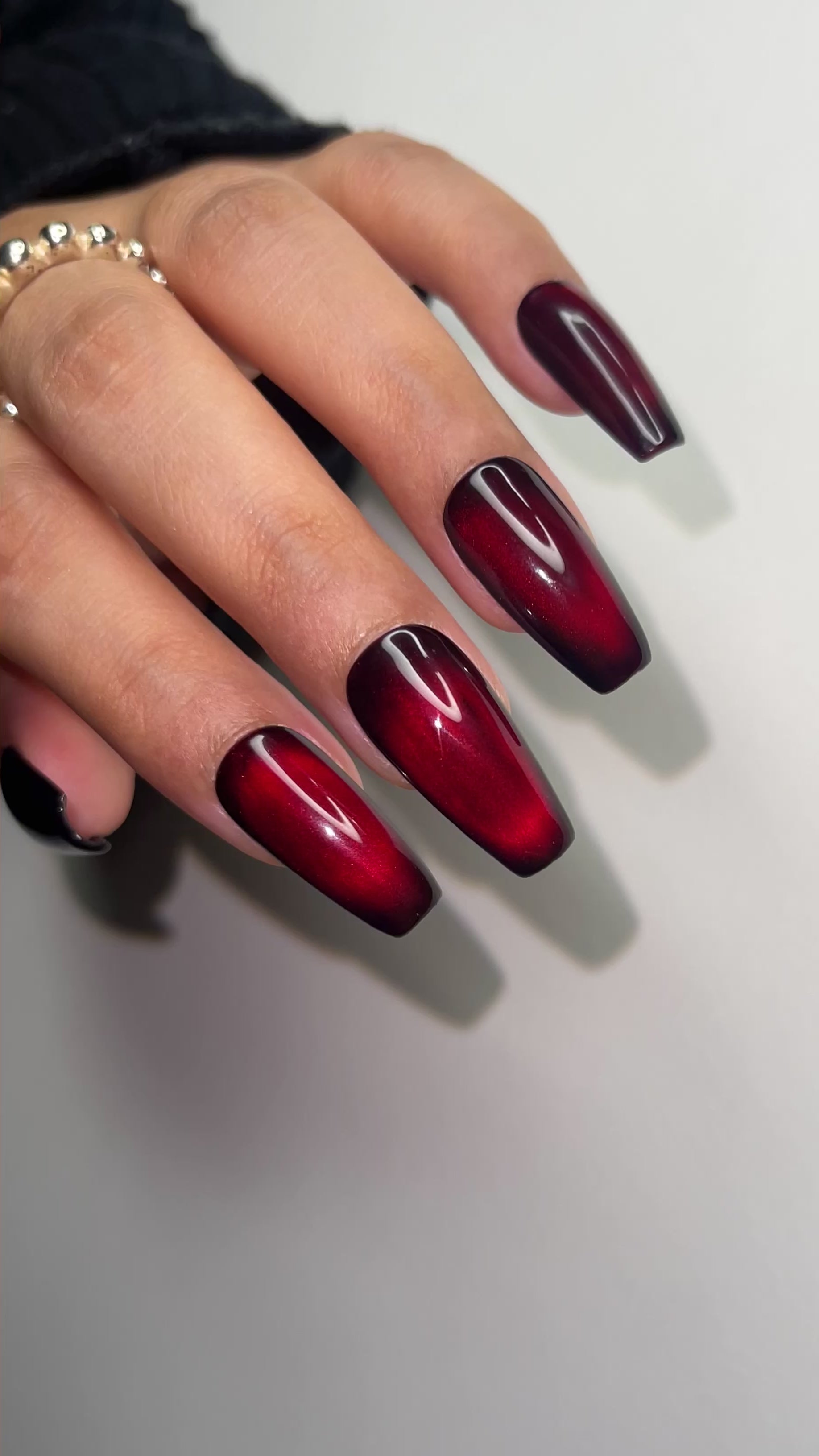 A rich deep red hue with hypnotic cat-eye depth—dramatic, sultry, and statement-making.